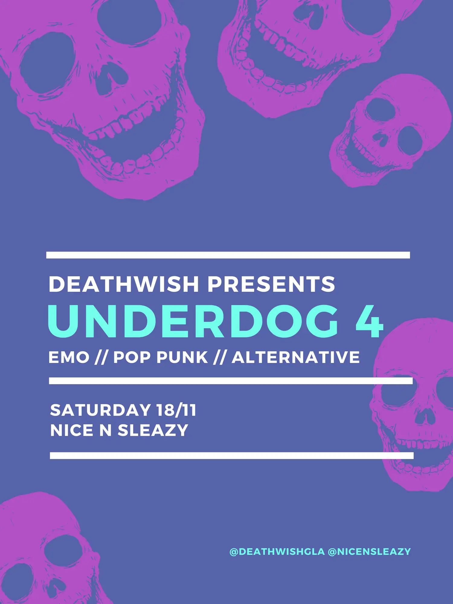 Fourth instalment of DEATHWISH's "Underdog" alternative club night at Nice n Sleazy.   Emo / Pop punk / Alternative