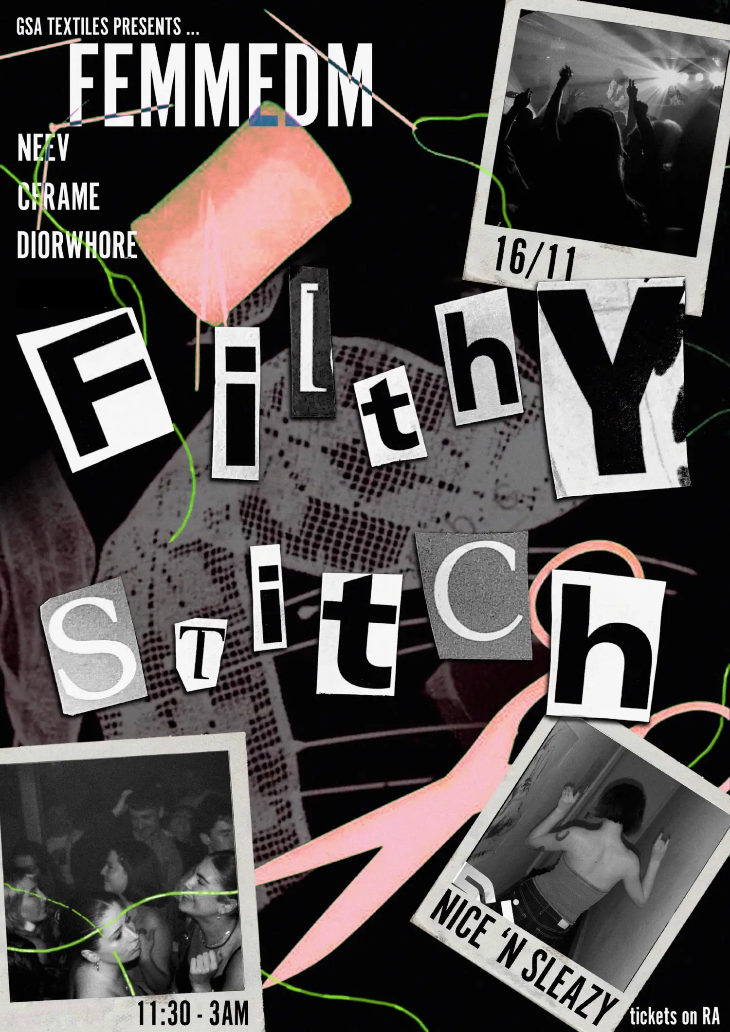 GSA Textile Design presents Filthy Stitch featuring FemmeDM. Help out in fundraising for our exhibition at New Designers in London next summer! We are joined by three incredibly talented DJs: Neev, Cframe and Diorwh0re who will ensure a stellar night of hard groove, garage, and techno. 16/11, Nice N Sleazy, don't wanna miss it