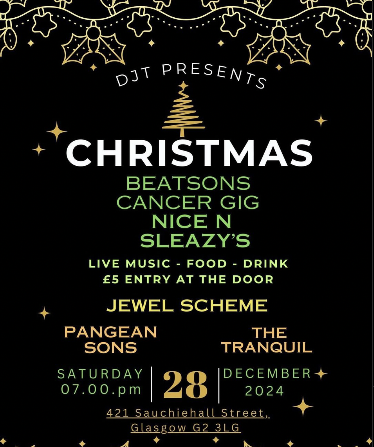 DJT promotions is holding a charity night in @nicensleazy 28/12/24 for @beatsoncharity if you fancy a wee night out it’s feature @pangean.sons and @jewelscheme and @the_tranquil_band you can buy tickets from ourselves, the bands or the link below if you can’t make it and want to donate you can do so on the just giving […]