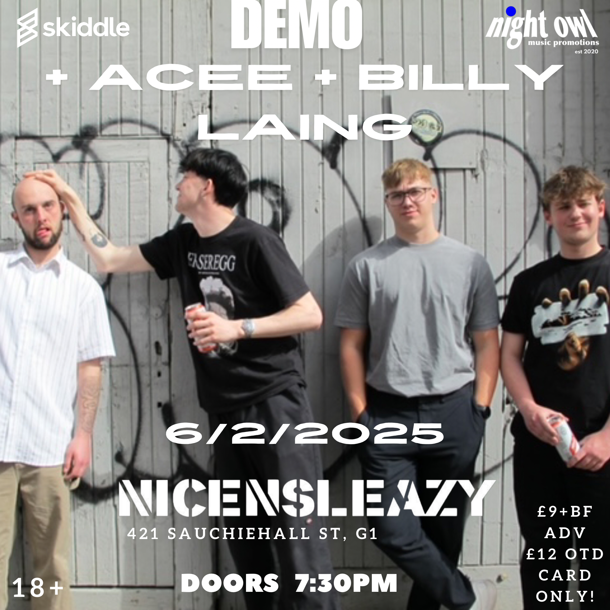 Come support three amazing acts from across Scotland at Nice N Sleazy in the heart of Glasgow's city centre! DEMO will be taking to the stage as our headline band along with support from ACEE and solo artist BILLY LAING will be opening the show! DOORS 7:30PM 18+ CARD ONLY!